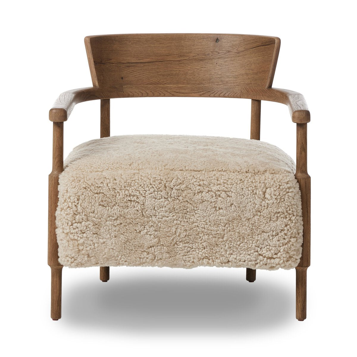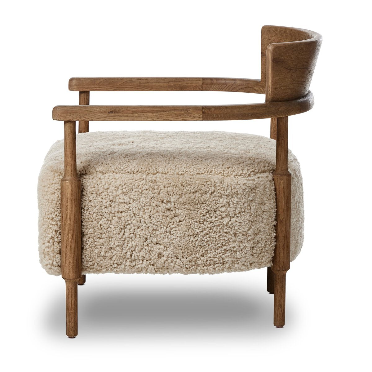 A new classic is created by blending the look and charm of traditional woodworking with thick cushion seating. The frame of the chair is crafted from solid oak and features gently turned dowel legs, plus arm rails that wrap around the back in a perfect U shape. Covered in 100% natural shearling.
