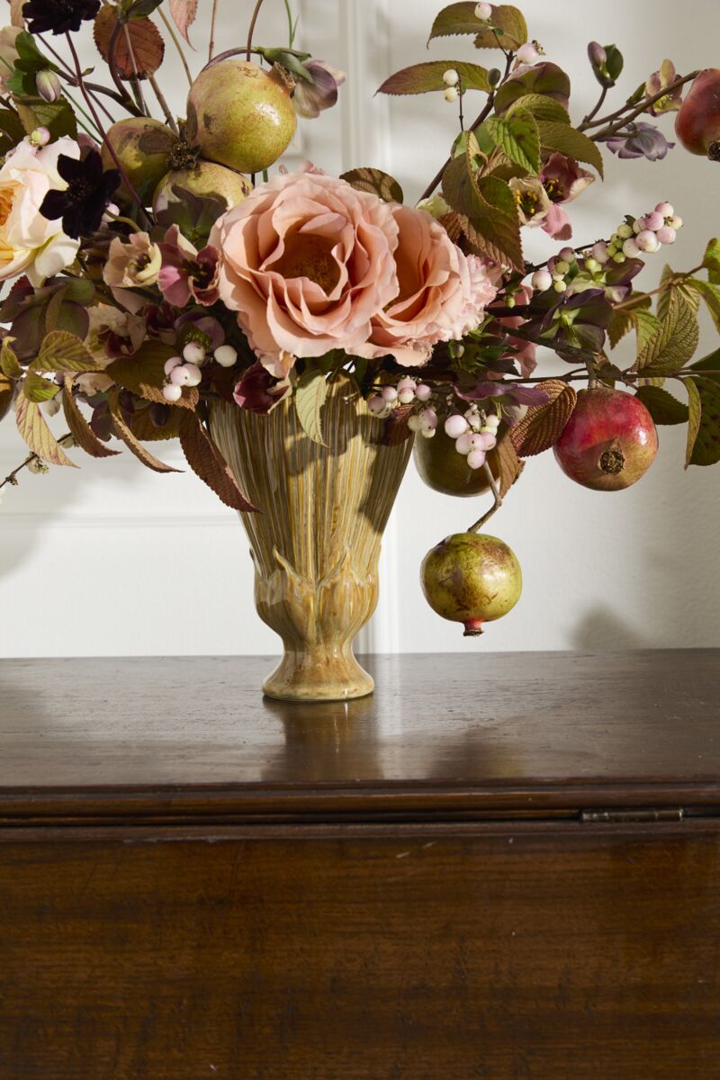 This large ceramic vase features delicately molded petal details that come together above a rounded foot, forming a graceful scalloped rim. Finished in a warm ochre hue that enhances its dimensional design, this vase adds an elevated, artful touch to any space. Style it alongside the smaller size for a striking harvest table display, or enjoy its timeless beauty throughout the year.